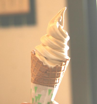 出入り口にソフトクリームを売るブースがあります。子ども連れには痛い場所ですが避けては通れません。まあ、珍しいからとそばソフトを購入。