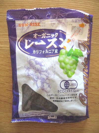 天然酵母用のレーズンが見つからないなあと思いながら、いろんなスーパーに行ってはドライフルーツの棚をチェックしていた私。でも、ひょんなところで見つかったのです。それは帯広厚生病院の売店。ね、びっくりでしょう?何となく覗いているとオーガニックの文字が印刷されているレーズンの袋。裏の表示を見たら植物油脂の言葉がありません。「これは買い~!」と買ったのであります。