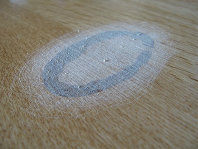 朝起きて夫が「たいへ~ん!」と騒いでいます。何かと思ったら、手作り洗剤(清水とリンゴ酢洗剤とエッセンシャルオイル)のスプレーボトルがダイニングテーブルの上に置いてあって、液体がもれていたようです。よって、こんなはっきりした輪染みに・・・。