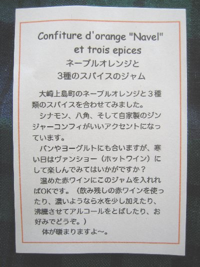 ブーランジェリー・ラ・フォンティヌ・ドゥ・ルルドで買いました。ジャムとしては高価なので、私だけのお楽しみです。赤ワインに入れてナイトキャップにしたところ、ワインももちろんおいしかったのですが、ワインを十分に吸ったネーブルのピールが美味。ピールがごろごろと入っているので存在感があります。今度はワインと多めに入れたピールでゆっくりと楽しみます。