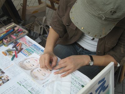 そこに「似顔絵描きます」の看板を出して、座っている女性が・・・。私も大昔に描いて貰った記憶(正しくは描いて貰った絵が家に飾ってあった記憶です)があり、描いて貰ってもいいかなと言う値段設定でもあったので、5歳児と1歳児を描いて貰うことにしました。