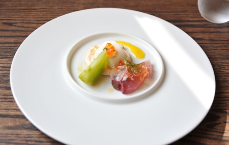 鮭のムースの上に根セロリのブラマンジェ
