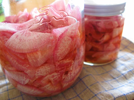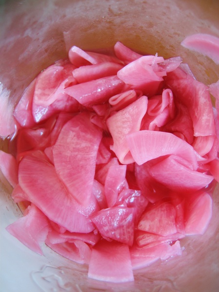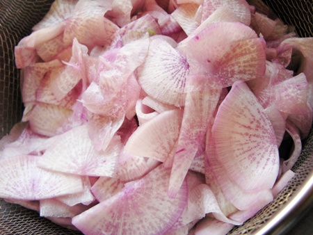 紫大根を頂きました。紫大根を検索しても酢漬け以外の調理法があまりなく、箸休めにも良いかと思って、早速取りかかることに。