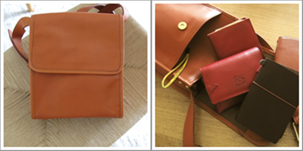 とてもシンプルなショルダーバッグに決めました。使い込むといい色になってきそうです。バッグの中には三つ折り財布とトラベラーズノートのパスポートサイズ・カード入れとペンケースが余裕で入ります。夫用に買ったのに、私の物を入れてシミューションです。きっときっと、私の肩にピッタリでしょう。