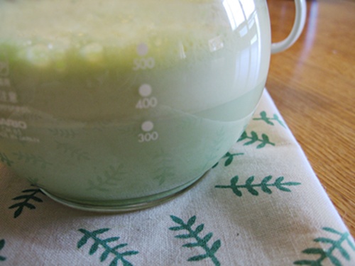 耐熱ポット(我が家はハリオのティーサーバー)に牛乳を入れてレンジで温めます。温めた後にお抹茶を好きなだけ入れて、バーミックスの泡立てツールで泡立てるだけ。