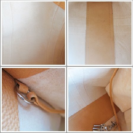 厚めの革でA4サイズの書類がすっぽりと入ります。内側は内張はなく、そのままですが問題はないですし、とても気持ちよくなめしてあります。ちょっとしたアクセントにはハミをかたどったアクセサリーに革ひもが付いていて、取っ手にクルクル巻くことによってバッグの口が開くのを防いでくれます。キラキラ・ぴかぴかが苦手な私にはピッタリのアクセサリーです。