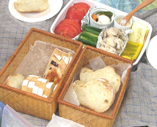 お昼はパンを切り、トマト・きゅうり・チキンを切るだけの本当に簡単なお弁当になりました。でも、外で食べると美味しく感じられるから不思議。