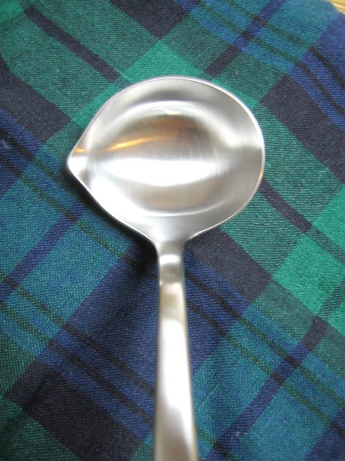 液だれもせずにいい塩梅です。見ているだけで嬉しいキッチン道具です。もう少しお玉の大きさがあってもいいかなと感じがします。が、これはソースレードル。大きなお皿にわざわざ作ったソースをトロリとかける道具でしょう。我慢、我慢。