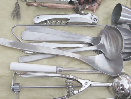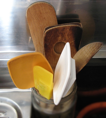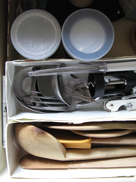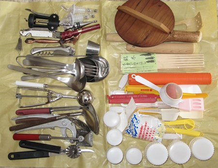 粉類を出し入れしやすい「フタつけるんです」などのプラスティック類と小さなお玉をリストラです