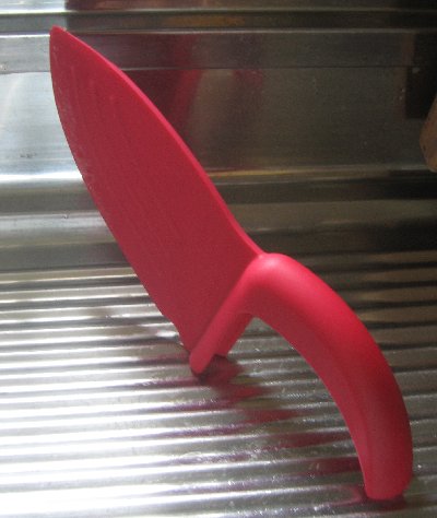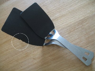 格好がよく、使い勝手が良さそうで買ってきて貰ったのですが、思ったほど使い勝手はよくありません。厚さが中途半端に厚く、フライパンとその焼いている物の間にきちんと差し込まれないこともあります。きちんと焼き上がっていればそんなこともないのでしょうが、様子を見るために焼き面を見るって言うこともあるので、早くも失敗を感じるわけです。特に焼き切れていない餃子は皮がフライパンと仲良くしてしまって、無惨な事に・・・。また、フライパンの上で切り分けて出すことも多いのですが、ターナーがしなって、切り口がきれいになりません。