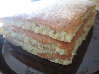 なにもフライパンの上で切らなくとも・・・とお思いの方もいらっしゃるでしょうが、私の焼き方は(パンケーキやホットケーキ)何枚か焼いていって、最後の一枚を裏返した時に焼き上がっていたケーキをもう一度フライパンに戻して温めて重ねたままサクッと切り分けると、アツアツのまま食卓に出せますよね。するとメープルシロップやバターがよくしみ込んで、おいしく食べることが出来ます。変なこだわりなんですが。