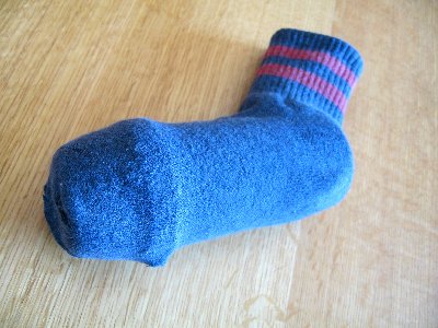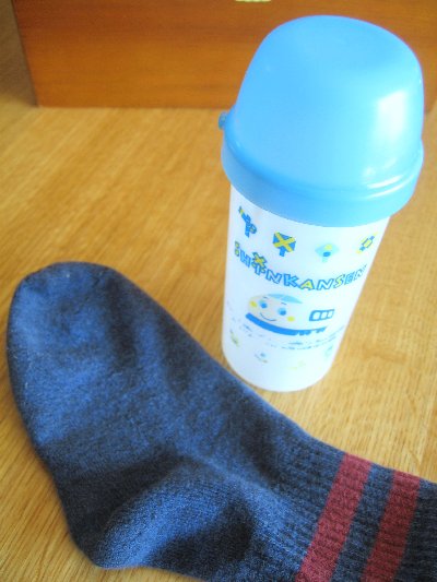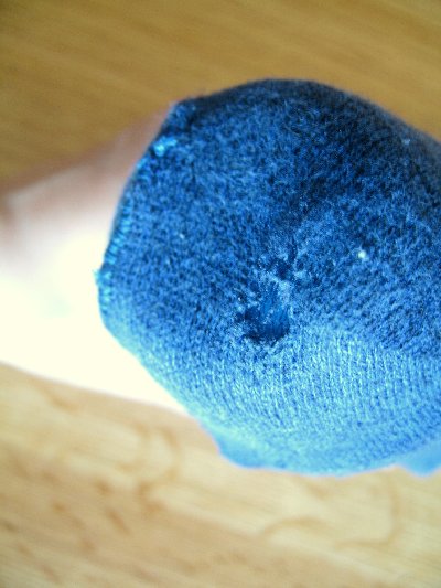 皆さんはご存じでしょうが、やってみて「やっぱり、チクチクしやすい。」と思ったのでご紹介です。本来なら電球がいいのでしょうが、要するに筒状になっていて先端が丸いものをソックスの中に入れて縫うととっても楽に繕えます。