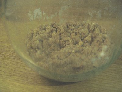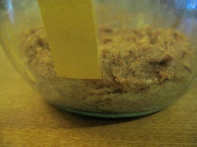 酵母液50CCと全粒粉60gを混ぜます。金属のスプーンではなく木の物がいいようです(金属だと消毒しなければならないです)。混ぜても固く、きれいに混ざりませんが、神経質にならなくても大丈夫です。