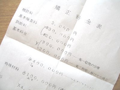 それから大人は器具や処置を含めて40万円(マルチブラケット)かかります。そして透明ブラケットにすると10万円。これは上下のお値段ですが、基本的にそこの歯科医院ではどちらか片方の矯正はいしないと言うことでした。片方しても、将来的にしていない片方がトラブルの原因になるかもしれないということで。