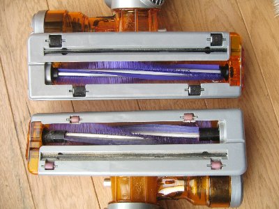 パッと見、どこがどう改良されているのかわからないと思いますが、まずローラーについているゴムの長さが長くなったことがあります。ゴムの部分が多くなった分、ゴミをより多く掻き込めるようになったのだと思います。また、ローラーの前後についている小さなローラーも大きくゴム仕様になっています。床でも転がりをよくしたのでしょうね。