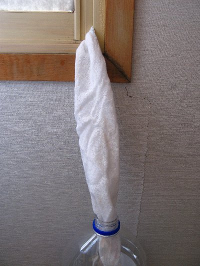 毛細管現象の利用です。水を吸い取りやすいガーゼを水滴がたまる部分にあてます。それから片方の端をペットボトルなどの容器の口に垂らします。すると・・・。