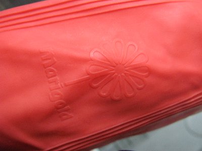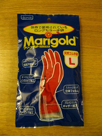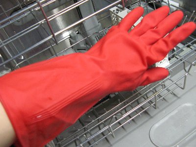 と100円で売っている物を使っていたのですが、誰だったか「ゴム手袋を赤にすると俄然やる気が出る。」というようなことを言っていたのをきっかけに、私の好きな「赤」のゴム手袋をするようになりました。そのゴム手袋がコレ。それまでのものと決定的に違うのがゴムのしなやかさ。指にまとわりついたりくっついたりすることもなく、薄いですが60℃のお湯もへっちゃらです。また、手のひらのグリップさせるための模様もきちんと役割を果たします。