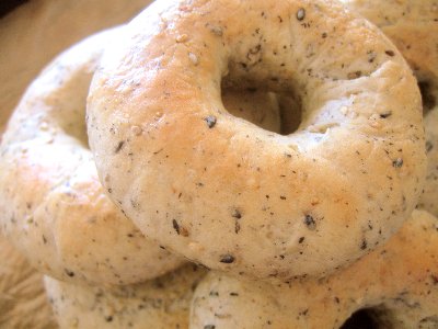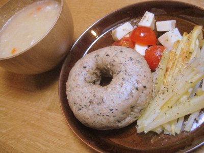 先日ベーグルを焼いた時には紐状にして閉じました。ところが綴じ目が甘くて、いびつな形に。味わいはあっただけに残念賞でした
