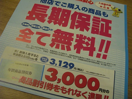 ヤ★ダ電器で購入していないのに、3000円ちょっとの年会費を払えば、出張費と修理費が無料だというサービスです。それも、サービスに加入してから購入した物だけが有効ではなく、さかのぼって有効にしてくれるという、うれしいものです。