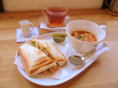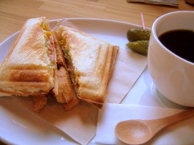 コチラのカフェはホットサンドの軽食が食べられます。今日の具はレタスと卵とベーコン。あくまでも軽食なので、食べた人みんながお腹いっぱいになるような量ではないでしょう。1つ1つ丁寧に焼かれているホットサンドでした。また、珈琲は手でドリップされていましたし、紅茶は葉から蒸らされていました。時間は多少かかっても、こういうのってうれしいですよね。