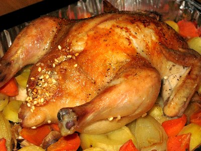です。詰め物はご飯をバタとにんにくで炒めてコンソメで味付けしました。今回は小振りな鶏だったので230℃で40分くらいオーブンに入れました。このローストチキンはお肉の柔らかさが特徴ですが、野菜のおいしさも見逃せません。生の野菜を並べるとどうも火の通りが悪くて、半生のこともあるので、今回は軽く人参とタマネギとジャガイモを電子レンジで火を通しました。これが正解