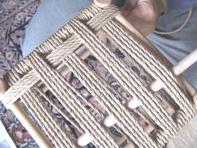 前回の椅子の張り替えより、交差が少ない分だけラクだそうです。しかし、今回のペーパーコ-ドがYチェアのそれよりも太いので、編んでいくのも扱いが面倒だったり(狭い通し穴に入りづらいのです)。編んでいく役割と引っ張る役割を2人ですれば早いです。引っ張る力もそんなに必要ないように見えました。