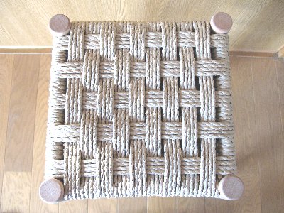 さえあれば簡単です。ただ、座面に出てくる4本の支柱の頭(写真のスツール座面に出ている突起)の切りっぱなし状態を丸くするかどうかで手間と時間が変わります。夫は若干削っていました。前回の椅子の張り替えより、交差が少ない分だけラクだそうです。しかし、今回のペーパーコ-ドがYチェアのそれよりも太いので、編んでいくのも扱いが面倒だったり(狭い通し穴に入りづらいのです)。編んでいく役割と引っ張る役割を2人ですれば早いです。引っ張る力もそんなに必要ないように見えました。