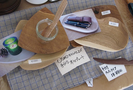 食器、子供服の他、今回は冒険として夫の作った木のシリーズも並べてみました。