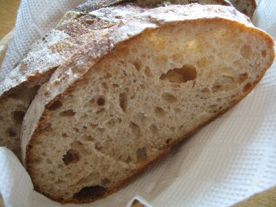 天然酵母は噛みごたえがあって粉の味がします。このパンにトマトとソーセージを挟んでマスタードをかけて食べると赤ワインにぴったりでしたよ。