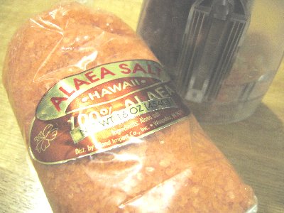 このアラエアシーソルトはミネラル(マグネシウム、カルシウム、鉄分)をたっぷり含んでいるとか。赤い色はハワイの赤土の色を長時間煎って、ハワイの海から取れたお塩を加えるからだそう。この赤土は(アラエア(ALAEA))ハワイ周辺の海底にある火山土壌(赤土)のことですが、お塩に土が含まれているって言うのも、おいしいとはいえ複雑です。