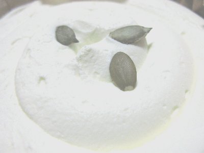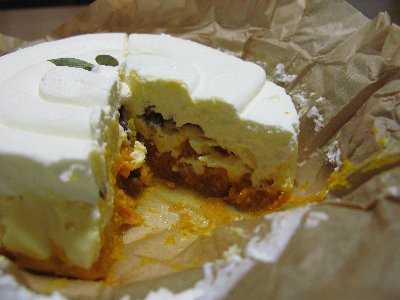 上のホイップクリームが見るからにふわふわです。食べ頃はとにかく冷たいままで食べる方がいいようです。あらかじめ半解凍か冷凍状態で切り分けると言いそうです。私は何も読まずトライして、切り口が写真のように不細工になってしまいました。