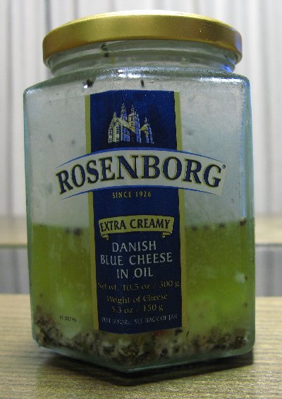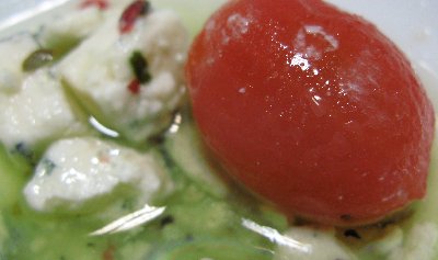 瓶の中にサイコロ状のブルーチーズがゴロゴロ入っています。食べてみると、おいしいのだけれど、そのままで食べるのではあまりにもしょっぱい、しょっぱいです。夫の実家からたくさんもらって来ていたミニトマトの「愛子」と一緒にしてみました。