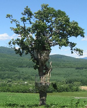 みの虫型のツリーハウスが柏の木にくっついています。当然と言えば当然ですが立ち入り禁止。見に来た人みんながみんな登っていったら、壊れるだろうなあと思われる、頑丈ではない作りに見えます。
